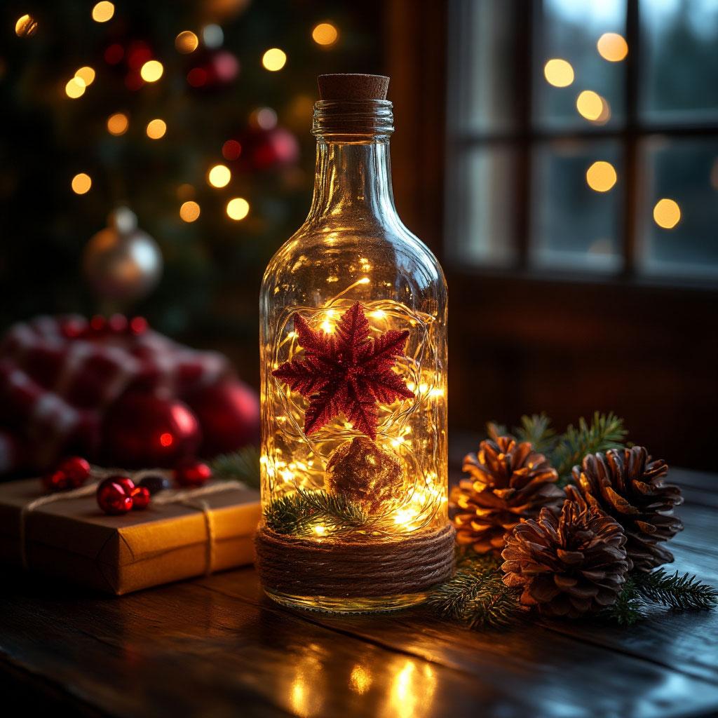 Для этого изделия нам понадобились: стеклянная бутылка (отлично подойдет и из-под лимонада), белые акриловые краски, салфетки с зимними узорами, ножницы, клей ПВА, кисти, нарядная ленточка и, конечно же, гирлянда. Техника, которую мы использовали, – декупаж.